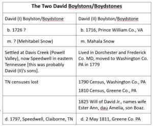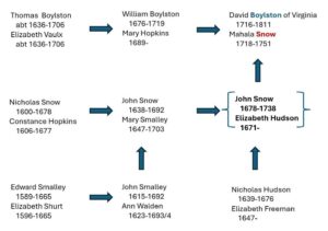 PDF VERSION Version: 25 Nov 2025 The Boydston-Snow Connection, Part 2 By Marcia C. Field and Richard L. Tolman, Ph. D. The Boydston-Snow Problem Part 1 details the ancestry of David Boydston/Boylston and his family. This continuation of the Boydston-Snow problem deals with the ancestry of David Boydston’s wife Mahala Snow (they were married 1737 …