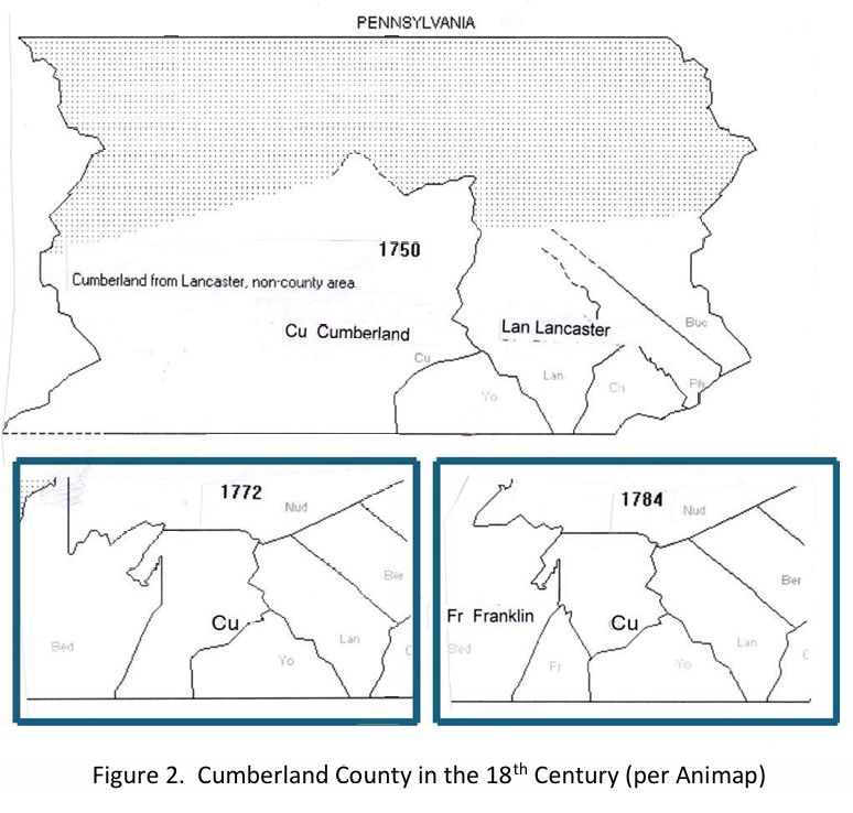 13.  John Patton (III) was born abt 173955See Biographical note: Findagrave #25830514: ‘Mary Patton genealogy’ per Kenneth McAlpine; hereafter Kenneth McAlpine genealogy. Mr. McAlpine, a descendant of Mary Patton (6), has access to the Patton Family Bible.,56Big Spring Presbyterian membership, age 50 in 1789-1792, image 45/229. at Tyborn, West Pennsboro, Cumberland, Pennsylvania571790 U. S. Census of Hopewell, Newton, Tyborn, and West Pennsboro, Cumberland, Pennsylvania, Roll M637_8, Page 8; Household of 3: 1male over 16, 2females; online at Ancestry. and died 1809 at Huntingdon Twp, Westmoreland, Pennsylvania.58Westmoreland County was created in 1773 from Bedford, which was created in 1772 from Cumberland County. Fayette County was created in 1783 from Westmoreland. ,59John Patton Will, he names wife Sarah and sons William, James, Joseph, Thomas, and Robert (caretaker of plantation and widow; he stipulates that proceeds of plantation sale to be distributed equally among gsons named) and daus Joan Thompson and Rosannah McKean, Mary Patton, Fanny Cowan, Betsy Hamilton. He mentions son Joseph and grandson John Patten, Wm and his son John, James and his son John and James’ son John Thompson, Joseph Thompson, Fanny’s son John Cowan and Samuel Hamilton, son of son-in-law Robert Hamilton, and Thomas and his son John; online at FamilySearch https://familysearch.org/ark:/61903/3:1:3Q9M-C9BL-69TS-5, Westmoreland Will Books 1773-1917 hereafter 1808 John Patton Will. He is the son of John Patton60Kenneth McAlpine genealogy (II) and a possible brother of Hezekiah Patton61Big Spring Presbyterian membership of Cumberland County, Pennsylvania.62There is a confounding Patton family in Cumberland County, Pennsylvania in the early 18th century. Joseph Patton (1746-1822, Findagrave #27390610) and his wife Sarah Weir (1750-1832, Findagrave #27390699) had a large family in Washington, Fayette County (formerly Westmoreland and before that Cumberland County). These Pattons were of Scottish origin. Note the poorly documented family trees on Ancestry ‘Burkhart/McClain/Corwin-Curwin/Guild Family Tree’ owner: MaryTrich2 www.ancestry.com/family-tree/person/tree/3392362 (hereafter MaryTrich2 Tree and ‘My Family Tree’ owner: Michelle Swanson www.ancestry.com/family-tree/person/tree/10556671 (hereafter Michelle Swanson Tree). John Patton (1742-1810) is not easily accommodated into this family. Unfortunately, the Pattons had a short list of children’s names they drew from, and one must be very careful to sort out John’s children from Joseph’s.,63To clarify: Joseph and Sarah Weir Patton’s children (those not born in Fayette/Cumberland are not included): Mary (1776-1832), Rebecca (1778-1853), John (1780-1862), David (1781-1810), Thomas (1784-1874), Joseph (1784-1851), Robert (1791-1856), and James (1793-1856). The 1820 U. S. Census of Washington, Fayette, Pennsylvania of the Joseph Patton household of 8: 1male under 10, 2males 10-15, 2males 16-25, 1male over 45, 1female 16-25, 1female over 45; online at Ancestry.,64A Joseph Patten enclave deciphered: 1850 U. S. Census of Washington, Fayette, Pennsylvania, M432_29, Family 1449, Thomas (age 69) and Anna (age 57) and five children. There are at least five Patten families here—John and Margaret (both age 57; Thomas’ brother John—son of Joseph) with Stephen (age 19), four children of Thomas and Anna plus Hiram (age 35, son of John) and Harriet (age 31) and their five children, and John (age 70) and Nancy (age 69, b. Lancaster PA) with Ellen (age 20, b. Fayette, PA); online at Ancestry. See Michelle Swanson Tree. He fought in the Revolutionary War; he was a Major in the Pennsylvania Rifle Regiment.65United States, Revolutionary War Rolls, Pennsylvania Military Records 1775-1783; online at FamilySearch https://www.familysearch.org/ark:/61903/1:1:QL6Y-HN13. He is found twice with William Patton in the tax enumerations of 1793661793 Septennial Census of Cumberland County, Pennsylvania (a tax enumeration); online at Ancestry.: Septennial Census of Cumberland County (Westpennsboro) and Newville, Cumberland, both are farmers in the first and Wm is a cooper in the second septennial census. John is listed alone in the 1800 U. S. Census of West Pennsboro and the 1800671800 U. S. Census of West Pennsboro, Cumberland, Pennsylvania, Roll M32_38, Page 117; online at FamilySearch https://www.familysearch.org/ark:/61903/1:1:XHRD-LLP; Household of 7: 1male under 10, 1male 10-15, 1male over 45, 1female under 10, 1female 10-15, 2females 26-44. Septennial Census of Cumberland and Mifflin, Cumberland. To summarize, John spent his early and middle life in today’s Cumberland county (West Pennsboro Twp), close to Newville, Cumberland where the Big Spring Presbyterian Church was located (abt 4 miles west of Carlisle). Toward the end of his life (1802) he moved west to North Huntingdon Twp on the western edge of Westmoreland County where several of his children had relocated (Joseph)