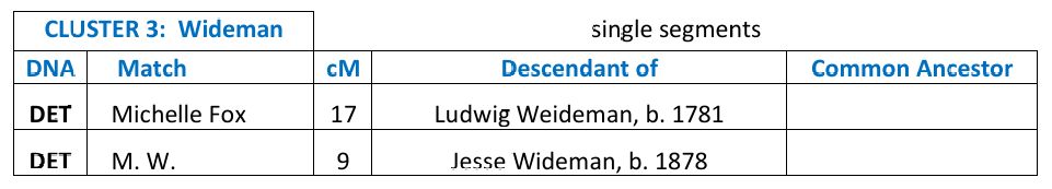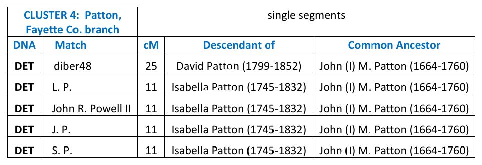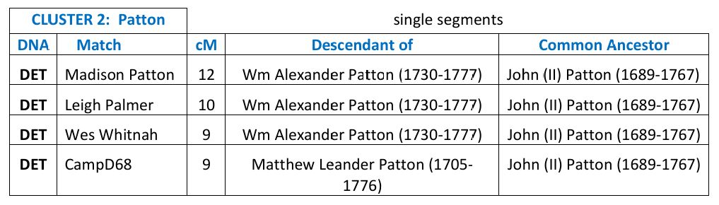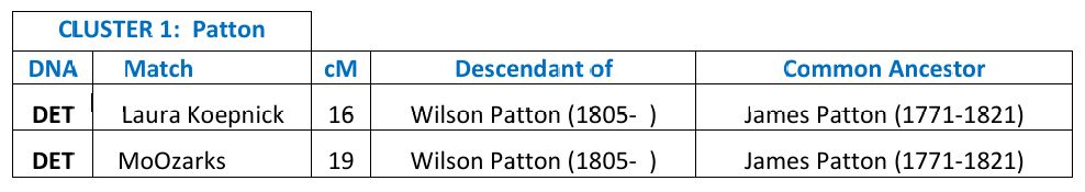 Darlene Essig Tolman (DET), a descendant of the Pattons of Pennsylvania had her DNA sequenced; a search of the DET DNA for Patton/Pennsylvania and Patton/Kentucky1Some matches did not realize their Kentucky Pattons came from Pennsylvania. gave more than 40 matches. A 19th century Common Ancestor (CA) for two matches was readily identified (see Cluster 1).
