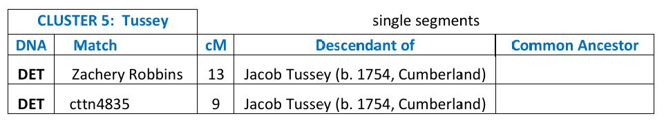 John Patton (II)’s wife was Susannah Tussey;9The RootsWeb WorldConnect Community Trees Index (Ancestry) has Susannah (1683-1751) as John (I)’s wife, but without any sources. This is a conflict with Matilda Wideman, John (I)’s proven wife and also is impossible to reconcile with the Charity legend from South Carolina. she was not John (I)’s wife!101767 Will of John Patton [this is John (II)], Pennsylvania, U.S., Wills and Probate Records, Southampton Twp, Cumberland County, Wills A-C, 1750-1779, images 106-7/361, mentions wife Susannah, dau Mary Johnson, son William, nephew Robert Patton, and Abigall Tassey; online at Ancestry; hereafter 1767 Will of John Patton. Some have given her the middle name of Charity as there is a reference to a ‘Charity’ in connection with John (I)’s servitude in the Carolinas, but this is not appropriate. A search of DET’s DNA for Tussey/PA identified two matches lending strong support to Susannah Tussey being on the direct line. Jacob’s father was John Tussey of New Castle, Delaware and he died at Tussey Mountain, Cumberland County, Pennsylvania (see Cluster 5).