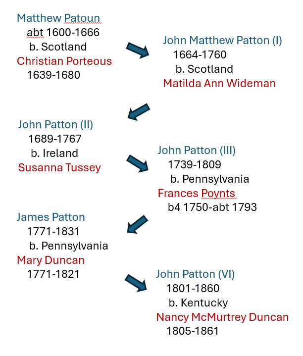 This essay complements the Duncan essay published earlier in 2025. It describes the patriarchal lineage of John Patton (1771-1821), husband of Nancy McMurtry (Duncan) Patton. A detailed genealogy of John and Nancy’s family is described in ‘Two Duncan Families: Scotland to Pennsylvania and Kentucky/Missouri’ on the 29deadpeople website.