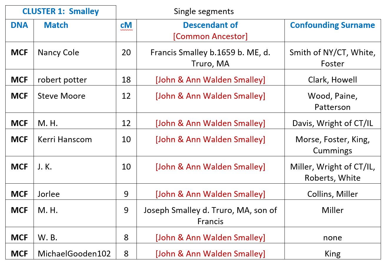 It is straightforward to confirm whether John Snow married to Elizabeth Hudson is a son of John (I) and Mary Smalley Snow. Search of MCF’s DNA for Smalley/Massachusetts gave 31 matches and 19 of them have an MCF CA [John and Ann Walden Smalley]]—these are the parents of Mary Smalley. Additionally, there are 3 matches with a different and earlier CA [Edward and Elizabeth Shurt Smalley] —the proposed grandparents1717. Underhill p. 22 endorses Shebnah Rich’s (note 22) contention that Edward and Elizabeth Shurt Smalley are grandparents of Mary Smalley, but there is no supporting source (others have not accepted this linkage). The fact is that MCF’s DNA matches (‘Nancy Cole’ and ‘M. H.’) seems to add proof to this idea since DNA is shared from Francis Smalley of Truro. of Mary Smalley (See Cluster 1). Not all matches are included in the cluster—those with high-risk confounding surnames were omitted (see Part 1 for the confounding surname list). The CA’s are strong evidence of direct lineage, but ‘W. B.’ (8 cM, with no confounding surnames) has to be considered a proof.