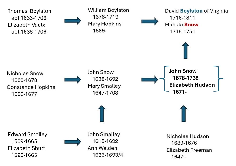 In summary, Smalley is on MCF’s direct line confirming the hypothesis that John Snow, husband of Elizabeth Hudson, is a son of John and Mary Smalley Snow and grandson of Nicholas Snow.